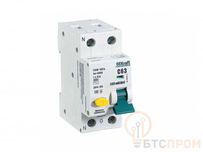 Автоматический выключатель дифференциального тока серии ДИФ-103 DEKraft; 1P+N; ном.ток 63 А; характеристика C; откл.способность Icn = 6 kA; ток утечки 100 мА; тип - АС; блок дифф.защиты – электронный; ширина – 2 мод. х 18 мм; монтаж – на DIN-рейку. АВДТ применяются в сетях напряжением до 220 В пер.тока для защиты человека от поражения электрическим током и электроустановок от сверхтоков и токов утечки. Аппараты ДИФ-103 являются более компактным вариантом АВДТ по сравнению с серией ДИФ-101.