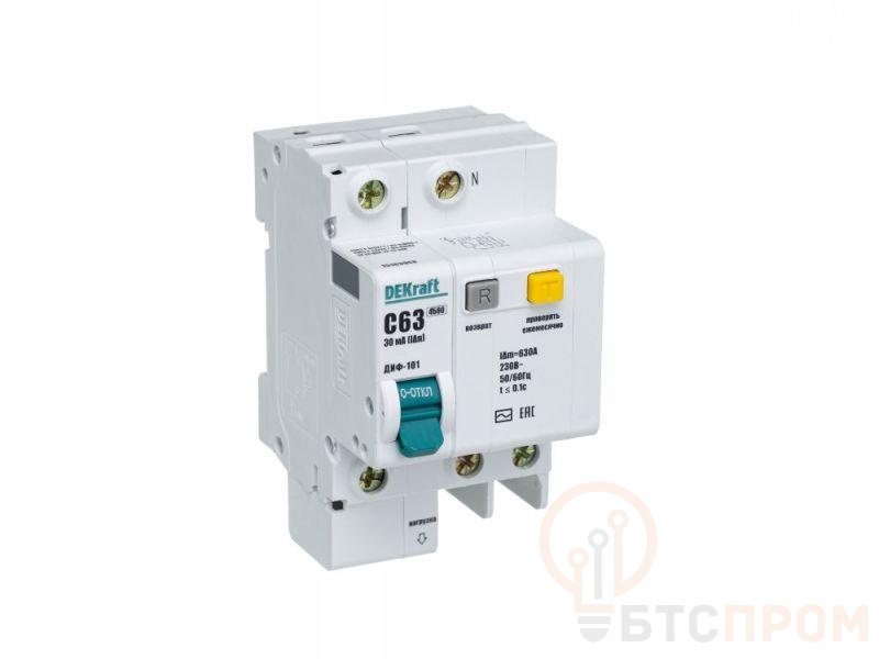 Автоматический выключатель дифференциального тока серии ДИФ-101 Dekraft; 1P+N; ном.ток 63 А; характеристика C; откл.способность Icn = 4,5 kA; ток утечки 30 мА; блок дифф.защиты – электронный; ширина – 3 мод. х 18 мм; монтаж – на DIN-рейку. АВДТ применяются в сетях напряжением до 220 В пер.тока для защиты электроустановок от сверхтоков и токов утечки. Для расширения функционала АВДТ возможно использование аксессуаров от выключателей серии ВА-101.