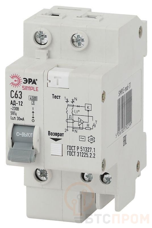 Выключатель автоматический дифференциального тока 2п (1P+N) C 63А 30мА тип AC SIMPLE-mod-35 Эра Б0039293
