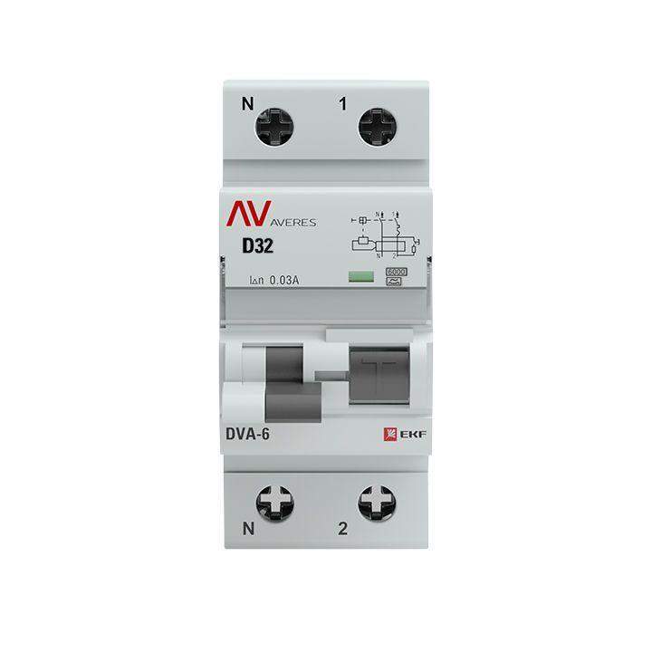 Выключатель автоматический дифференциального тока 2п (1P+N) D 32А 30мА тип A 6кА DVA-6 Averes EKF rcbo6-1pn-32D-30-a-av