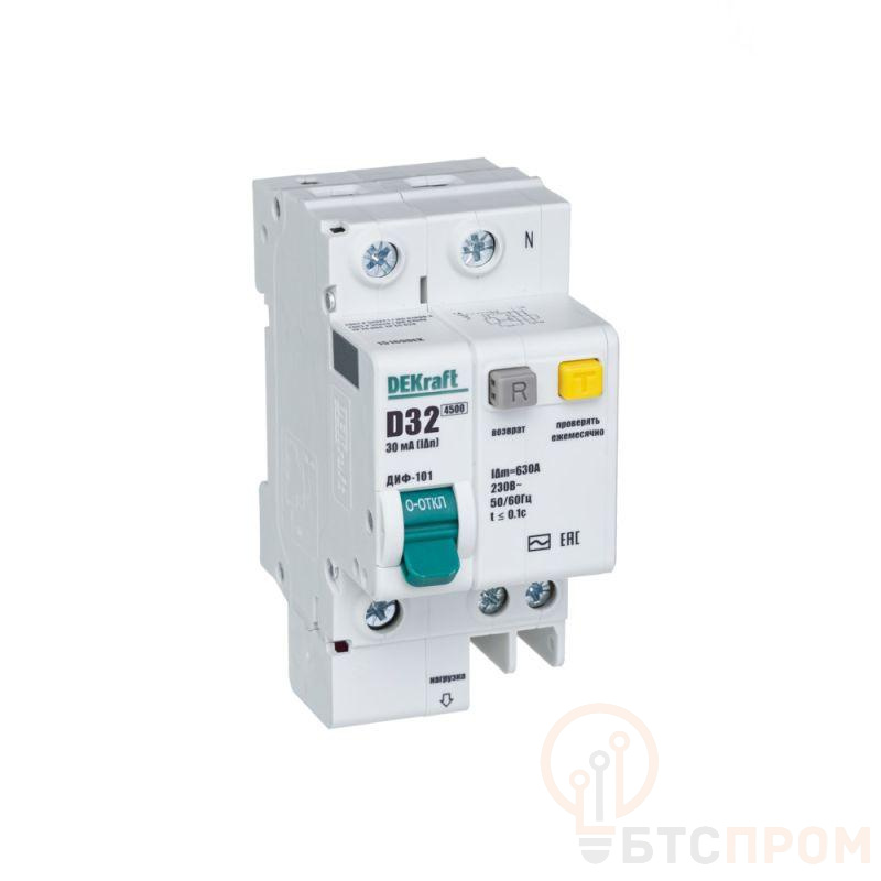 Автоматический выключатель дифференциального тока серии ДИФ-101 Dekraft; 1P+N; ном.ток 32 А; характеристика D; откл.способность Icn = 4,5 kA; ток утечки 30 мА; блок дифф.защиты – электронный; ширина – 2,5 мод. х 18 мм; монтаж – на DIN-рейку. АВДТ применяются в сетях напряжением до 220 В пер.тока для защиты электроустановок от сверхтоков и токов утечки. Для расширения функционала АВДТ возможно использование аксессуаров от выключателей серии ВА-101.