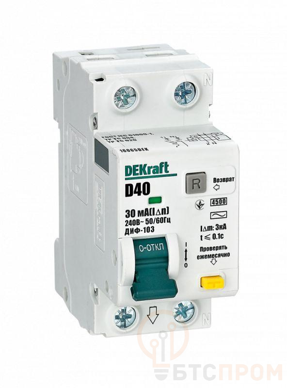 Автоматический выключатель дифференциального тока серии ДИФ-103 Dekraft; 1P+N; ном.ток 40 А; характеристика D; откл.способность Icn = 4.5 kA; ток утечки 30 мА; тип - АC; блок дифф.защиты and ndash; электронный; АВДТ применяются в сетях напряжением до 230 В пер.тока для защиты человека от поражения электрическим током и электроустановок от сверхтоков и токов утечки. Аппараты ДИФ-103 являются более компактным вариантом АВДТ по сравнению с серией ДИФ-101.
