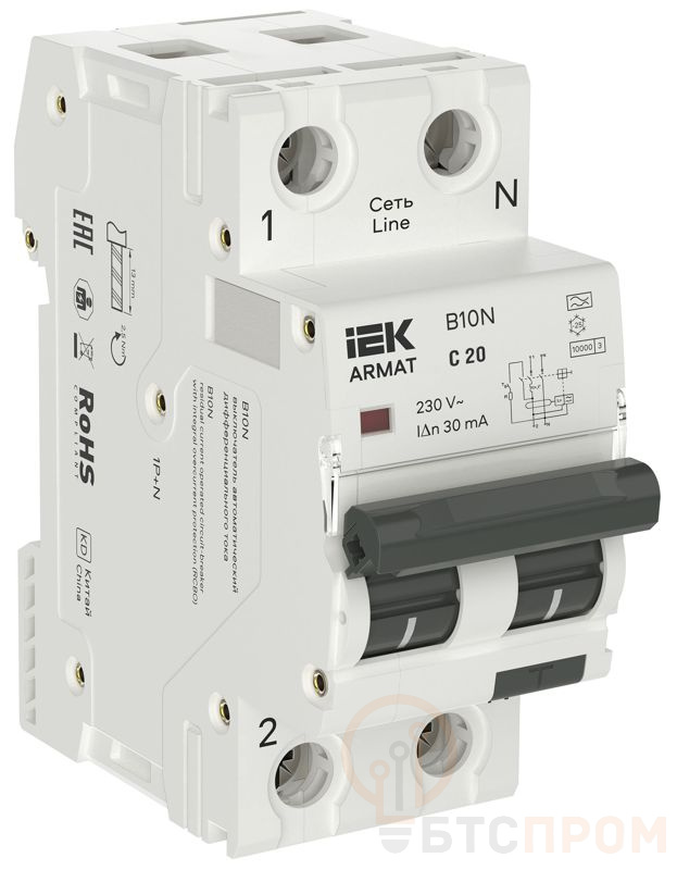 Выключатель автоматический дифференциального тока 2п (1P+NP) C 20 30мА тип A АВДТ B10N 36мм ARMAT IEK AR-B10N-1N-C020A030