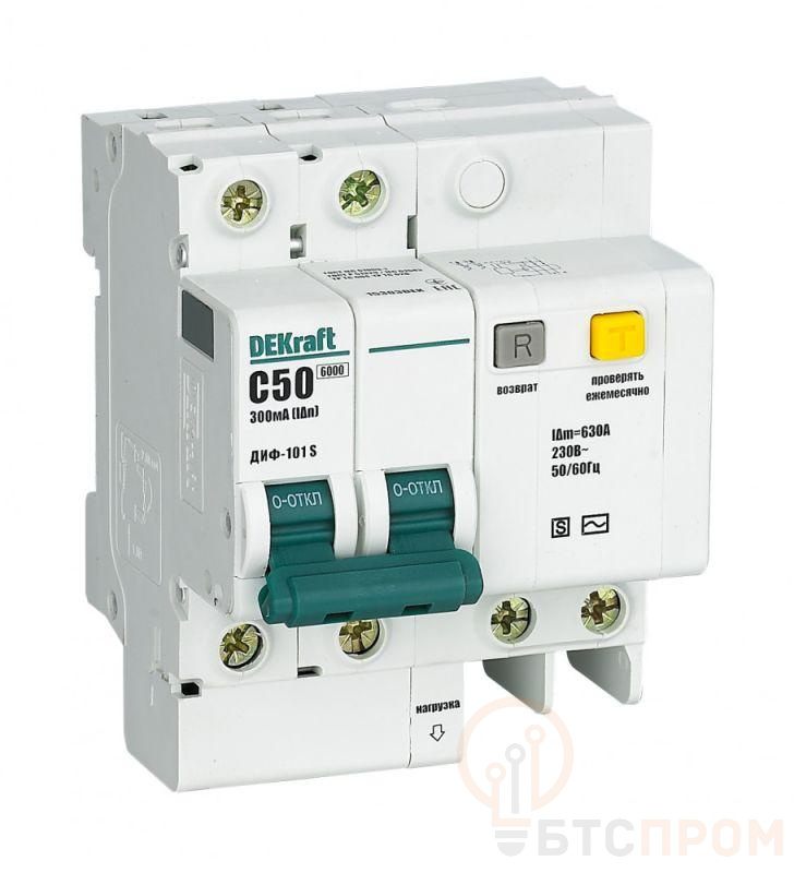 Автоматический выключатель дифференциального тока серии ДИФ-101 S Dekraft; селективный; 2P; ном.ток 50 А; характеристика C; откл.способность Icn = 6 кА; ток утечки 300 мА; блок дифф.защиты – электронный; ширина – 4 мод. х 18 мм; монтаж – на DIN-рейку. АВДТ применяются в сетях напряжением до 400 В пер.тока для защиты электроустановок от сверхтоков и токов утечки; в щитах, где требуется ступенчатая дифференциальная защита (задержка по срабатыванию).