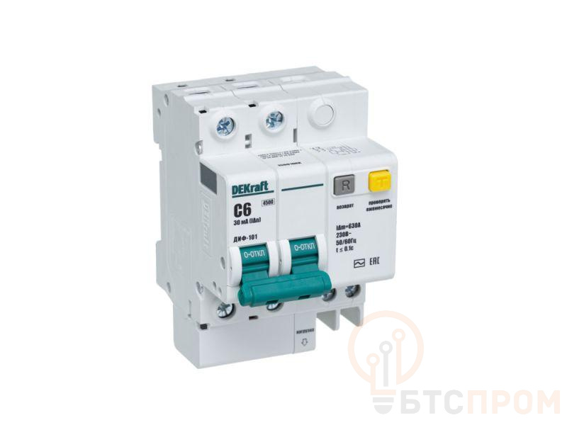 Автоматический выключатель дифференциального тока серии ДИФ-101 Dekraft; 2P; ном.ток 6 А; характеристика C; откл.способность Icn = 4,5 kA; ток утечки 30 мА; блок дифф.защиты – электронный; ширина – 3,5 мод. х 18 мм; монтаж – на DIN-рейку. АВДТ серии ДИФ-101 применяются в сетях напряжением до 400 В пер.тока для защиты человека от поражения электрическим током и электроустановок от сверхтоков и токов утечки. Для расширения функционала АВДТ возможно использование аксессуаров от выключателей серии ВА-101.