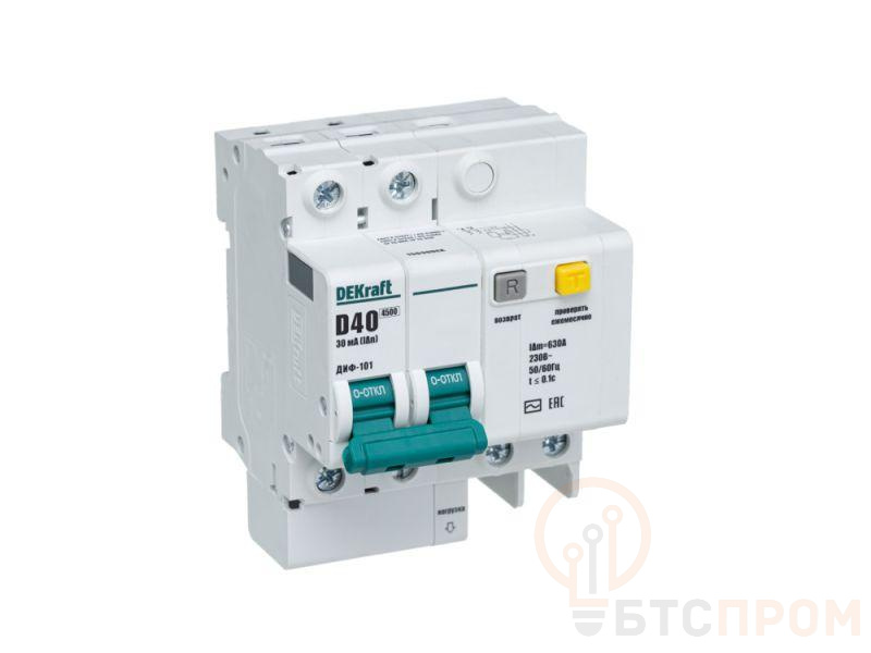 Автоматический выключатель дифференциального тока серии ДИФ-101 Dekraft; 2P; ном.ток 40 А; характеристика D; откл.способность Icn = 4,5 kA; ток утечки 300 мА; блок дифф.защиты – электронный; ширина – 4 мод. х 18 мм; монтаж – на DIN-рейку. АВДТ серии ДИФ-101 применяются в сетях напряжением до 400 В пер.тока для защиты электроустановок от сверхтоков и токов утечки. Для расширения функционала АВДТ возможно использование аксессуаров от выключателей серии ВА-101.