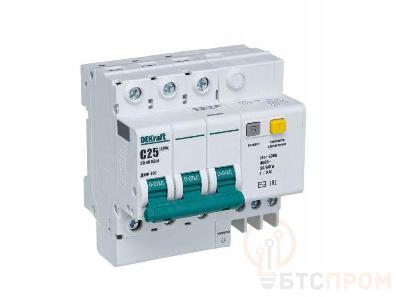 Автоматический выключатель дифференциального тока серии ДИФ-101 Dekraft; 3P; ном.ток 25 А; характеристика C; откл.способность Icn = 4,5 kA; ток утечки 30 мА; блок дифф.защиты – электронный; ширина – 5 мод. х 18 мм; монтаж – на DIN-рейку. АВДТ серии ДИФ-101 применяются в сетях напряжением до 400 В пер.тока для защиты электроустановок от сверхтоков и токов утечки. Для расширения функционала АВДТ возможно использование аксессуаров от выключателей серии ВА-101.