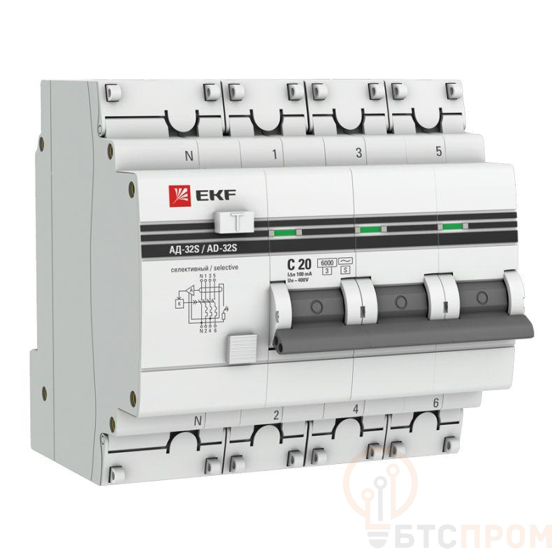 Выключатель автоматический дифференциального тока 3P+N 20А 100мА АД-32 (селективный) PROxima EKF DA32-6-20-100S-4P-pro
