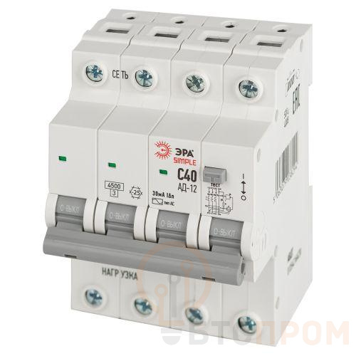 Выключатель автоматический дифференциального тока 3P+N C 40А 30мА тип АС АВДТ 4.5кА SIMPLE D12E4C40AC30 АД-12 электронное Эра Б0058930