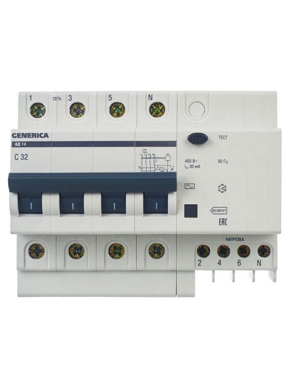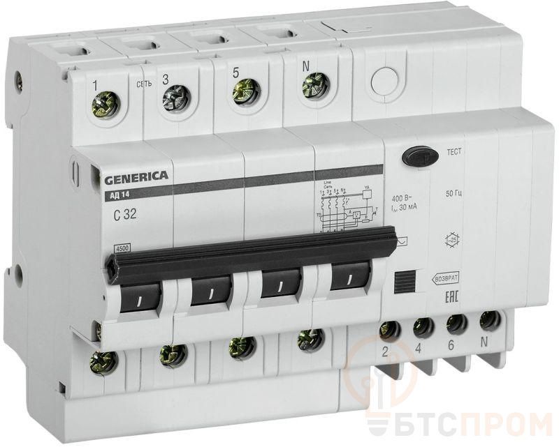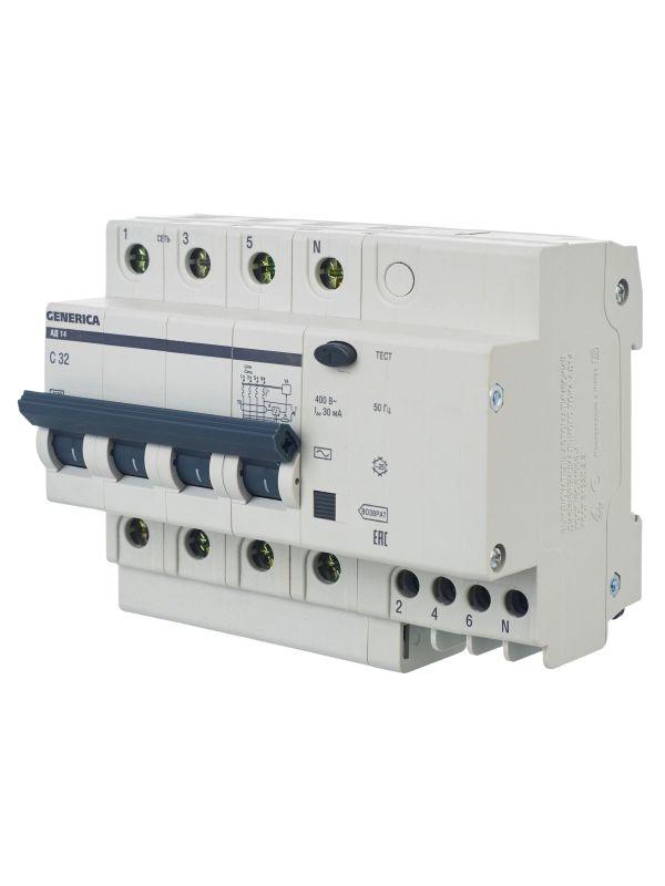 Выключатель автоматический дифференциального тока 4п 32А 30мА АД14 GENERICA MAD15-4-032-C-030 фото в каталоге от BTSprom.by
