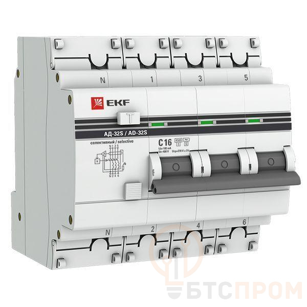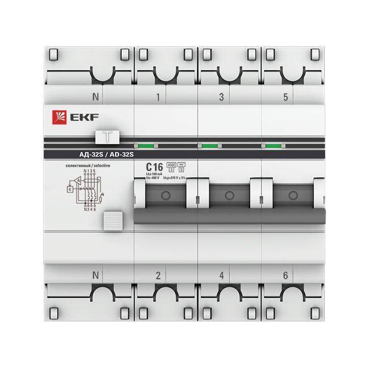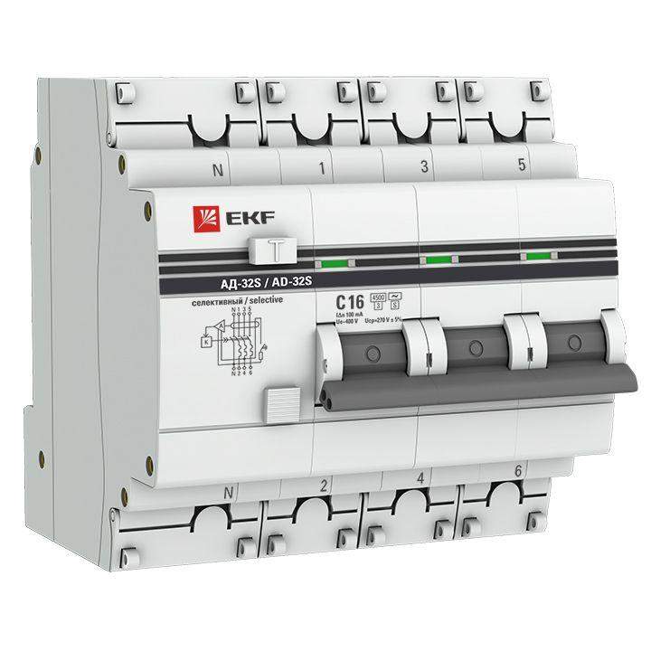 Выключатель автоматический дифференциального тока 4п (3P+N) 16А 100мА АД-32 селект. PROxima EKF DA32-16-100S-4P-pro