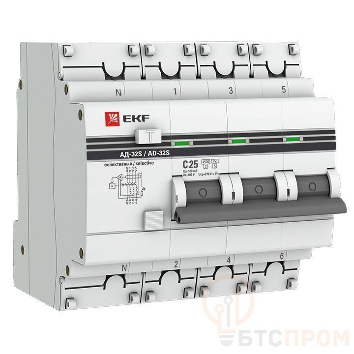 Выключатель автоматический дифференциального тока 4п (3P+N) 25А 100мА АД-32 селект. PROxima EKF DA32-25-100S-4P-pro