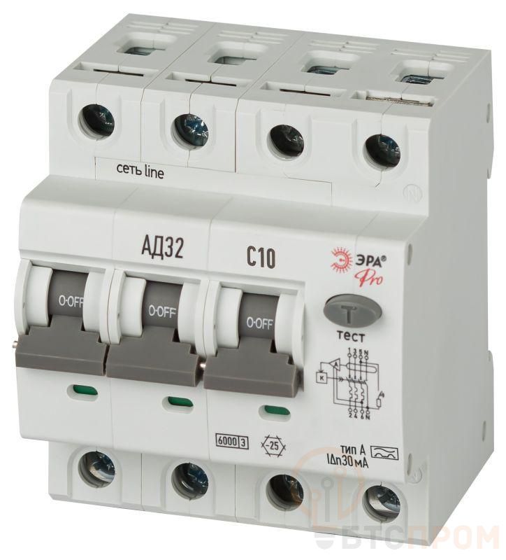 Выключатель автоматический дифференциального тока 4п (3P+N) C 10А 30мА тип А 6кА АД-32 электрон. PRO D326E4C10А30 Эра Б0059098