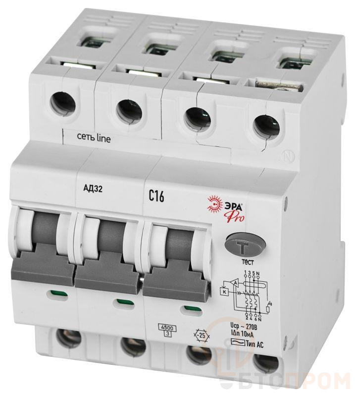 Выключатель автоматический дифференциального тока 4п (3P+N) C 16А 10мА тип AC 4.5кА АД-32 электрон. защита 230В PRO D32E4C16AC10P Эра Б0057809