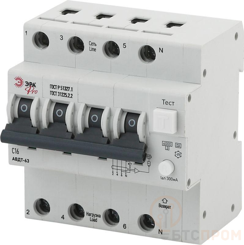 Выключатель автоматический дифференциального тока 4п (3P+N) C 16А 300мА тип A АВДТ 63 Pro NO-902-19 Эра Б0031869