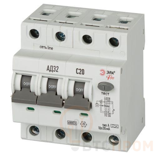 Выключатель автоматический дифференциального тока 4п (3P+N) C 20А 30мА тип А 6кА АД-32 электрон. PRO D326E4C20А30 Эра Б0059099