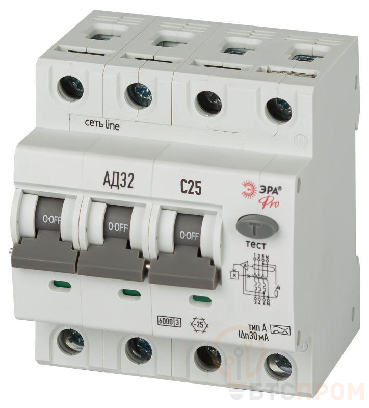 Выключатель автоматический дифференциального тока 4п (3P+N) C 25А 30мА тип A 6кА АД-32 электрон. PRO D326E4C25A30 Эра Б0059211