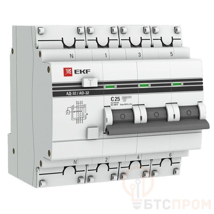 Выключатель автоматический дифференциального тока 4п (3P+N) C 25А 30мА тип AC 4.5кА АД-32 защита 270В электрон. PROxima EKF DA32-25-30-4P-pro