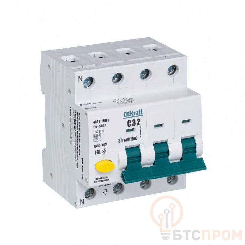 Автоматический выключатель дифференциального тока серии ДИФ-103 DEKraft; 3P+N; ном.ток 32 А; характеристика C; откл.способность Icn = 6 kA; ток утечки 30 мА; тип - АС; блок дифф.защиты – электронный; ширина – 2 мод. х 18 мм; монтаж – на DIN-рейку. АВДТ применяются в сетях напряжением до 220 В пер.тока для защиты человека от поражения электрическим током и электроустановок от сверхтоков и токов утечки. Аппараты ДИФ-103 являются более компактным вариантом АВДТ по сравнению с серией ДИФ-101.