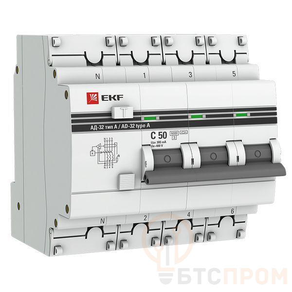 Выключатель автоматический дифференциального тока 4п (3P+N) C 50А 300мА тип A 6кА АД-32 защита 270В электрон. PROxima EKF DA32-6-50-300-4P-a-pro