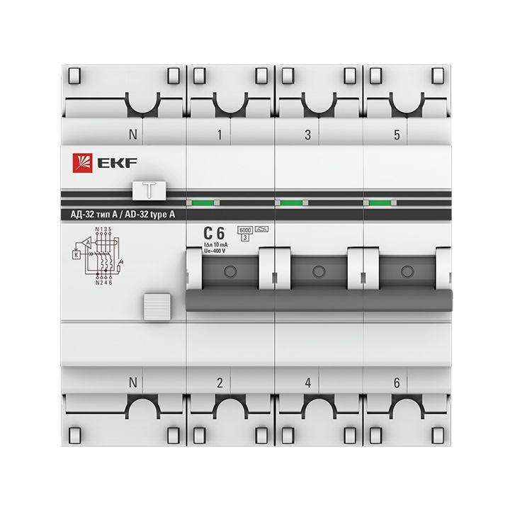 Выключатель автоматический дифференциального тока 4п (3P+N) C 6А 10мА тип A 6кА АД-32 защита 270В электрон. PROxima EKF DA32-6-06-10-4P-a-pro