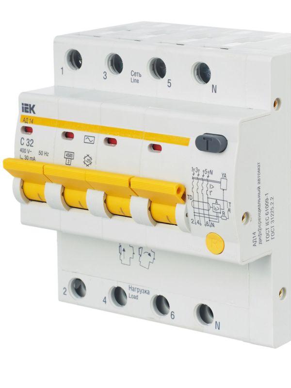 Выключатель автоматический дифференциального тока 4п C 32А 30мА тип AC 4.5кА АД-14 KARAT IEK MAD10-4-032-C-030