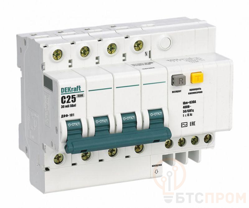 Автоматический выключатель дифференциального тока серии ДИФ-101 Dekraft; 4P; ном.ток 40 А; характеристика C; откл.способность Icn = 4,5 kA; ток утечки 30 мА; блок дифф.защиты – электронный; ширина – 8 мод. х 18 мм; монтаж – на DIN-рейку. АВДТ серии ДИФ-101 применяются в сетях напряжением до 400 В пер.тока для защиты человека от поражения электрическим током и электроустановок от сверхтоков и токов утечки. Для расширения функционала АВДТ возможно использование аксессуаров от выключателей серии ВА-101.