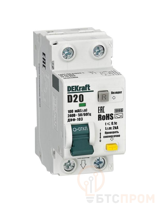 Выключатель автоматический дифференциального тока (АВДТ) 1P+N 20А 100мА AC х-ка D ДИФ-103 6кА DEKraft 16465DEK