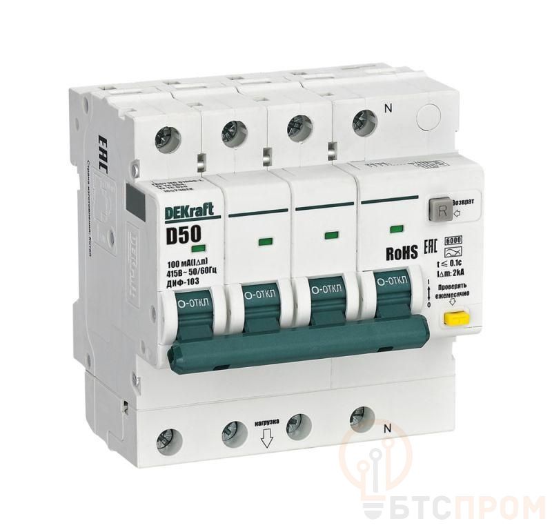 Автоматические выключатели дифференциального тока серии ДИФ-103 6кА NEW Dekraft; 3P+N; номинальный ток 50 А; ном. диф. ток 100 мА; тип диф. расцепителя - AC; кривая отключения - D; Icn, Ics = 6 кА; тип устройства - электронный; монтаж – на DIN-рейку. АВДТ обеспечивают три вида защиты — от короткого замыкания, перегрузки и возникновения утечки тока (в частности, вследствие прикосновения человека к токоведущим частям). АВДТ с отключающей способностью 6кА применяются во вводно-распределительных устройствах (ВРУ), главных распределительных щитах (ГРЩ), осветительных и распределительных установках в общественных, административных, производственных, промышленных и других подобных зданиях.
