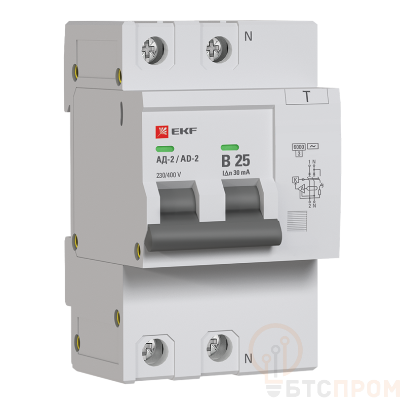 Выключатель автоматический дифференциального тока B 25А 30мА тип AC 6кА АД-2 (электрон.) PROxima EKF DA2-6-25B-30-pro