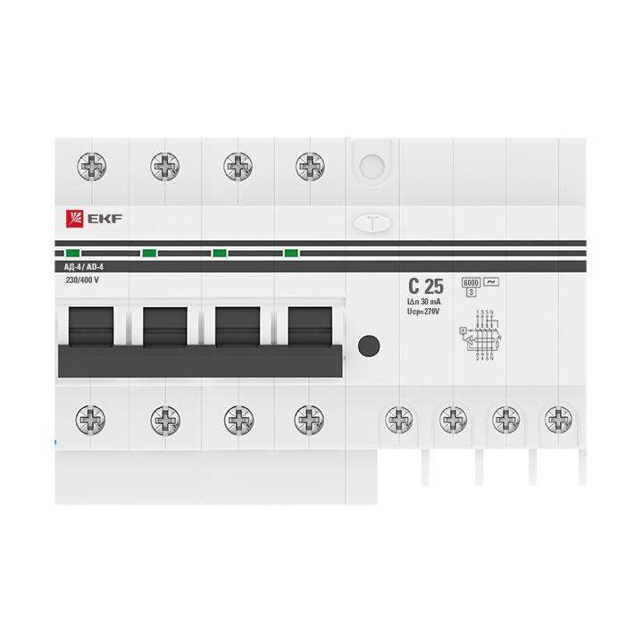 Выключатель автоматический дифференциального тока C 25А 30мА тип AC 6кА АД-4 (электрон.) защита 270В PROxima EKF DA4-6-25-30-pro