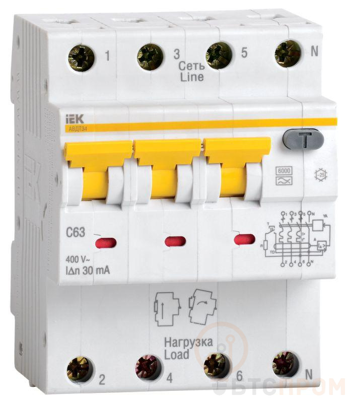 Автоматические выключатели дифференциального тока АВДТ34 предназначены для защиты человека от поражения электрическим током при повреждении изоляции электроустановок, для предотвращения пожаров вследствие протекания токов утечки на землю и для защиты от перегрузки и короткого замыкания в сетях переменного тока напряжением 400 В и частотой 50 Гц. АВДТ34 со встроенной защитой от сверхтоков реагируют не только на синусоидальные переменные дифференциальные токи, но и на пульсирующие постоянные дифференциальные токи. Источником пульсирующего тока являются, например, стиральные машины с регуляторами скорости, регулируемые источники света, телевизоры, видеомагнитофоны, персональные компьютеры и др. АВДТ34 выпускаются в четырехполюсном исполнении на номинальные токи 6, 10, 16, 20, 25, 32, 40, 50, 63 А и номинальные отключающие дифференциальные токи 10, 30, 100, 300 мА.
