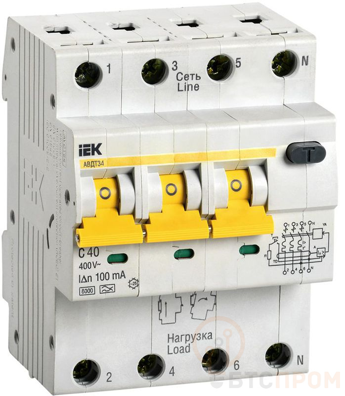 Автоматические выключатели дифференциального тока АВДТ34 предназначены для защиты человека от поражения электрическим током при повреждении изоляции электроустановок, для предотвращения пожаров вследствие протекания токов утечки на землю и для защиты от перегрузки и короткого замыкания в сетях переменного тока напряжением 400 В и частотой 50 Гц. АВДТ34 со встроенной защитой от сверхтоков реагируют не только на синусоидальные переменные дифференциальные токи, но и на пульсирующие постоянные дифференциальные токи. Источником пульсирующего тока являются, например, стиральные машины с регуляторами скорости, регулируемые источники света, телевизоры, видеомагнитофоны, персональные компьютеры и др. АВДТ34 выпускаются в четырехполюсном исполнении на номинальные токи 6, 10, 16, 20, 25, 32, 40, 50, 63 А и номинальные отключающие дифференциальные токи 10, 30, 100, 300 мА.