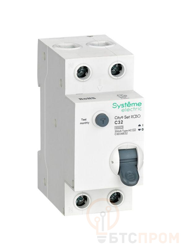 Автоматические выключатели дифференциального тока (АВДТ) серии City9 Set Systeme Electric,1P+N, номинальный ток 32 А, характеристика С, Icn = 6 кА, ток утечки 30 мА, тип АС. АВДТ применяется в электрических сетях напряжением 230В. Предназначен для защиты сети от перегрузок, людей от поражения электрическим током и токов короткого замыкания. Уставка по току утечки 30 мА обеспечивает гарантированную защиту людей при прямом прикосновении. Кнопка тест обеспечивает проверку работоспособности аппарата. Крепление на DIN-рейку шириной 35 мм. Безопасные клеммы.