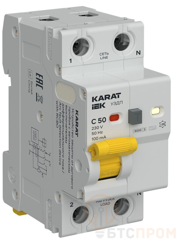 Устройство защиты от дугового пробоя с автоматическим выключателем дифференциального тока (УЗДП + АВДТ) 1P+N C 50А 100мА тип A KARAT IEK KA-DP12-1-050-C-100-A