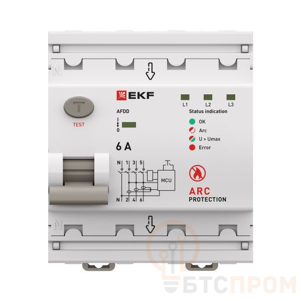 УЗДП 3P+N PROXIMA от EKF — интеллектуальная защита трёхфазных цепей 380-415 В от пожаров, вызванных дуговым пробоем. Устройство мгновенно распознаёт опасную дугу по форме тока и высокочастотным сигналам и отключает линию за доли секунды. Также реагирует на перенапряжение. Подключение — питание сверху к клеммам N, 1, 3, 5. Момент затяжки винтов — до 3 Н·м. На лицевой панели — светодиодные индикаторы, обозначающие причину срабатывания. Совместим с гребёнчатыми и U?образными шинами, соответствует ГОСТ IEC 62606, работает при –25…+40?°C, имеет класс защиты IP20, срок службы — 20 лет, гарантия — 7 лет.