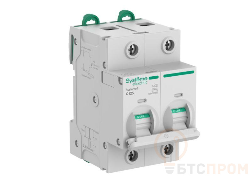 Автоматический выключатель S9НH, серии Systeme9, Systeme Electric, 2-полюсный, номинальный ток 125 А, характеристика C, Icn = 10 кА, Icu = 10 кА. Соответствует требованиям стандартов ГОСТ IEC 60898-1 и ГОСТ IEC 60947-2. Применяется в электрических сетях напряжением 400 В. Предназначен для защиты цепей от перегрузок и токов короткого замыкания. Оснащен безопасными клеммами с увеличенной до 50мм2 присоединительной способностью, механизмом мгновенной коммутации, индикаторами состояния контактной группы и срабатывания по причине аварии. Монтируется на DIN-рейку при помощи двухпозиционных защёлок, с возможностью демонтажа без снятия шины PIN.
