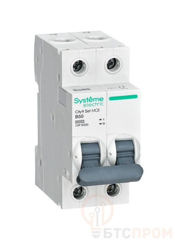 Автоматический выключатель серии City9 Set Systeme Electric, 2-полюсный, номинальный ток 50 А, характеристика B, Icn = 6 кА. Применяется в электрических сетях напряжением 230 В. Предназначен для защиты от перегрузок и токов короткого замыкания. Оснащен механизмом «мгновенной коммутации». Ударопрочный корпус из специального пластика с 6 металлическими заклепками. Безопасные клеммы исключают попадание кабелей в заклеммное пространство.