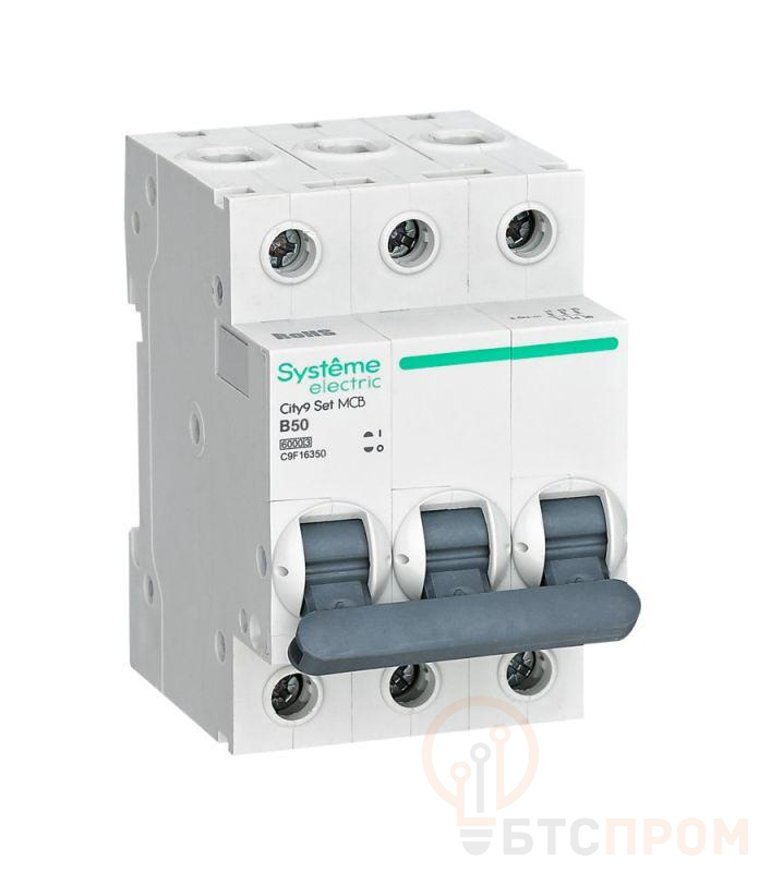 Автоматический выключатель серии City9 Set Systeme Electric, 3-полюсный, номинальный ток 50 А, характеристика B, Icn = 6 кА. Применяется в электрических сетях напряжением 400 В. Предназначен для защиты от перегрузок и токов короткого замыкания. Оснащен механизмом «мгновенной коммутации». Ударопрочный корпус из специального пластика с 6 металлическими заклепками. Безопасные клеммы исключают попадание кабелей в заклеммное пространство.