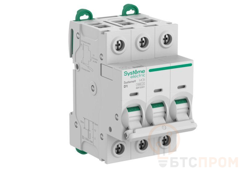 Автоматический выключатель S9FH, серии Systeme9, Systeme Electric, 3-полюсный, номинальный ток 1 А, характеристика D, Icn = 10 кА, Icu = 15 кА. Соответствует требованиям стандартов ГОСТ IEC 60898-1 и ГОСТ IEC 60947-2. Применяется в электрических сетях напряжением 400 В. Предназначен для защиты цепей от перегрузок и токов короткого замыкания. Оснащен двойными безопасными клеммами раздельного монтажа проводников, механизмом мгновенной коммутации, индикаторами состояния контактной группы и срабатывания по причине аварии. Монтируется на DIN-рейку при помощи двухпозиционных защёлок, с возможностью демонтажа без снятия шины PIN.