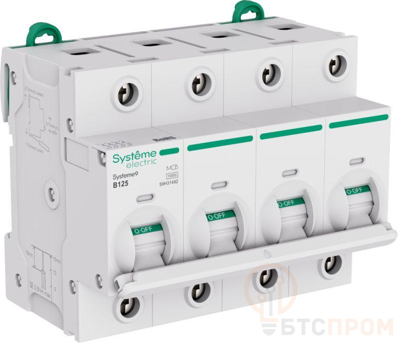 Автоматический выключатель S9НH, серии Systeme9, Systeme Electric, 4-полюсный, номинальный ток 125 А, характеристика B, Icn = 10 кА, Icu = 10 кА. Соответствует требованиям стандартов ГОСТ IEC 60898-1 и ГОСТ IEC 60947-2. Применяется в электрических сетях напряжением 400 В. Предназначен для защиты цепей от перегрузок и токов короткого замыкания. Оснащен безопасными клеммами с увеличенной до 50мм2 присоединительной способностью, механизмом мгновенной коммутации, индикаторами состояния контактной группы и срабатывания по причине аварии. Монтируется на DIN-рейку при помощи двухпозиционных защёлок, с возможностью демонтажа без снятия шины PIN.