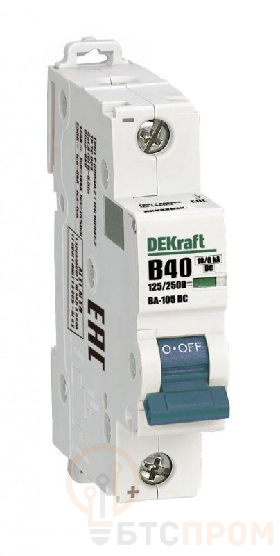 Автоматический выключатель серии ВА-105 DC Dekraft; 1P; ном. ток 40 А; характеристика В; откл. способность Icn = 10 кА при 125 В/6 кА при 250 В; установка – на DIN-рейку; ширина – 1 мод. х 18 мм. Выключатели ВА-105 DC применяются для защиты от перегрузки и КЗ в цепях постоянного тока, в частности в системах автоматизации и управления, транспорта, генерации и распределения электроэнергии и др. Окошко-индикатор всегда показывает состояние аппарата вне зависимости от положения рукоятки управления.