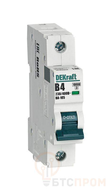 Автоматический выключатель серии ВА-105 Dekraft; 1P; ном. ток 4 А; характеристика В; откл. способность 10 кА; ширина модуля 18мм. Аппараты имеют механизм мгновенной коммутации, 6 монолитных заклепок, которые повышают прочность корпуса. Боковые каналы охлаждения повышают стабильность работы при высоких температурах окружающей среды. Есть возможность установки дополнительных аксессуаров с левой стороны устройства. Аппарат на 100% совместим с корпусами и оболочками Dekraft и Systeme Electric.