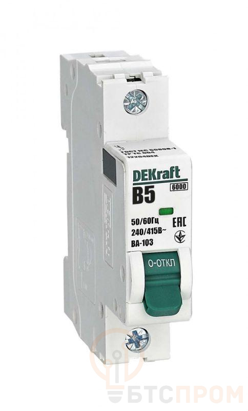 Автоматический выключатель серии ВА-103 NEW Dekraft; 1P; номинальный ток 5 А; характеристика B; отключающая способность 6 кА, что позволяет использовать аппараты в качестве вводных. 5 монолитных заклепок повышают прочность корпуса аппарата. Окошко-индикатор всегда показывает состояние контактов вне зависимости от положения рукоятки управления. Боковые каналы охлаждения повышают стабильность работы при высоких температурах окружающей среды. Есть возможность установки дополнительных аксессуаров с левой стороны устройства. Аппарат на 100% совместим с корпусами и оболочками Dekraft, Systeme Electric.