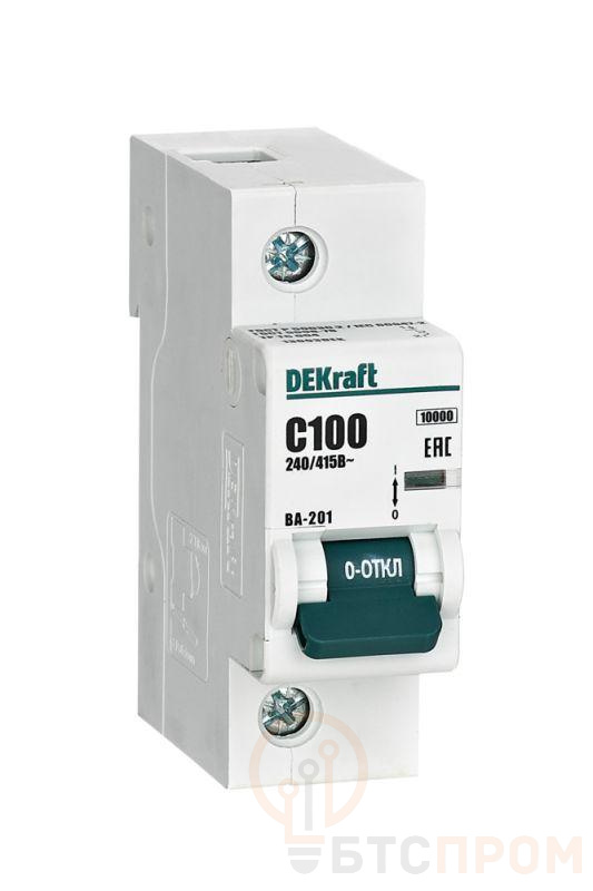 Автоматический выключатель серии ВА-201 Dekraft; 1P; номинальный ток 100 А; характеристика С; отключающая способность 10 кА; ширина модуля 27мм. Монолитная лицевая панель обеспечивает безопасную эксплуатацию аппарата. Окошко-индикатор всегда показывает состояние аппарата вне зависимости от положения рукоятки управления. Двухпозиционная защелка облегчает монтаж выключателя. Аппарат на 100% совместим с корпусами и оболочками Dekraft, Systeme Electric.