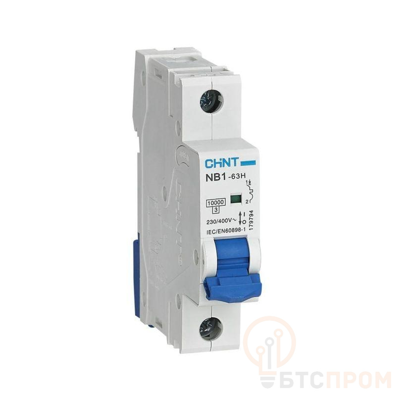 Модульные автоматические выключатели серии NB1-63H предназначены для применения в сетях переменного тока напряжением 220/400 В частотой 50/60 Гц с номинальным током до 63 А для нечастых включений и отключений нагрузок, а также защиты от перегрузки и короткого замыкания в электроустановках жилых, общественных и промышленных зданий. Основные характеристики: Номинальный ток – от 1 А до 63 А Исполнение по числу полюсов – 1P, 1P+N, 2P, 3P, 4P, 3P+N Тип характеристики мгновенного срабатывания – B, C и D Отключающая способность – 10000 A Механическая износостойкость – 20000 циклов В/О Электрическая износостойкость – 10000 циклов В/О Категория применения – A Класс токоограничения – 3 Степень загрязнения – 2 Степень защиты – IP20 Ширина полюса – 18 мм Монтаж – на симметричную DIN-рейку 35 мм Подключение – кабелем, шины типа PIN и FORK Сигнализация – окошко индикации положения главных контактов Автоматические выключатели серии NB1-63H дополнительно могут оснащаться следующими устройствами: - вспомогательный контакт состояния XF9; - сигнальный контакт аварийного срабатывания XF9J; - независимый расцепитель S9 или расцепитель минимального/максимального напряжения V9.