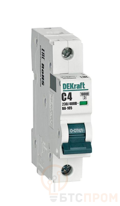Автоматический выключатель серии ВА-105 Dekraft; 1P; ном. ток 4 А; характеристика C; откл. способность 10 кА; ширина модуля 18мм. Аппараты имеют механизм мгновенной коммутации, 6 монолитных заклепок, которые повышают прочность корпуса. Боковые каналы охлаждения повышают стабильность работы при высоких температурах окружающей среды. Есть возможность установки дополнительных аксессуаров с левой стороны устройства. Аппарат на 100% совместим с корпусами и оболочками Dekraft и Systeme Electric.