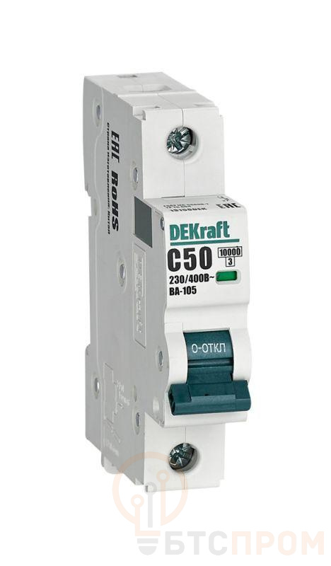 Автоматический выключатель серии ВА-105 Dekraft; 1P; ном. ток 50 А; характеристика C; откл. способность 10 кА; ширина модуля 18мм. Аппараты имеют механизм мгновенной коммутации, 6 монолитных заклепок, которые повышают прочность корпуса. Боковые каналы охлаждения повышают стабильность работы при высоких температурах окружающей среды. Есть возможность установки дополнительных аксессуаров с левой стороны устройства. Аппарат на 100% совместим с корпусами и оболочками Dekraft и Systeme Electric.