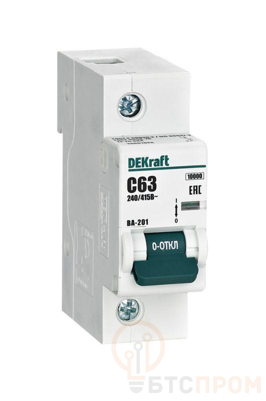 Автоматический выключатель серии ВА-201 Dekraft; 1P; номинальный ток 63 А; характеристика С; отключающая способность 10 кА; ширина модуля 27мм. Монолитная лицевая панель обеспечивает безопасную эксплуатацию аппарата. Окошко-индикатор всегда показывает состояние аппарата вне зависимости от положения рукоятки управления. Двухпозиционная защелка облегчает монтаж выключателя. Аппарат на 100% совместим с корпусами и оболочками Dekraft, Systeme Electric.