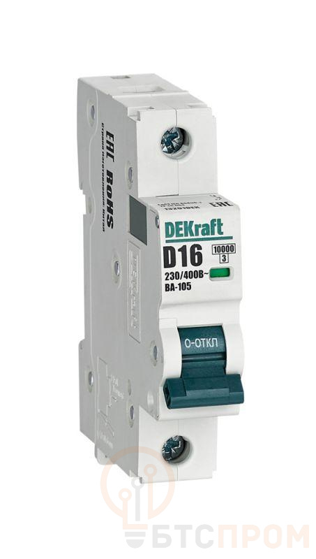 Автоматический выключатель серии ВА-105 Dekraft; 1P; ном. ток 16 А; характеристика D; откл. способность 10 кА; ширина модуля 18мм. Аппараты имеют механизм мгновенной коммутации, 6 монолитных заклепок, которые повышают прочность корпуса. Боковые каналы охлаждения повышают стабильность работы при высоких температурах окружающей среды. Есть возможность установки дополнительных аксессуаров с левой стороны устройства. Аппарат на 100% совместим с корпусами и оболочками Dekraft и Systeme Electric.